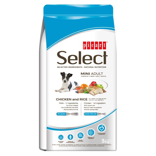 קו המזונות סלקט מיני של חברת ®Picart הספרדית מותאם בצורה מיטבית לצרכיהם של כלבים מגזע קטן, ומאופיין בערך תזונתי גבוה וויטמינים ומינרלים המסייעים בשמירה על השיניים, הלב, המפרקים, העור והפרווה. המרכיבים הייחודיים תורמים לשמירה על מצבם הפיזי והחיוניות של כלבים מגזע קטן.